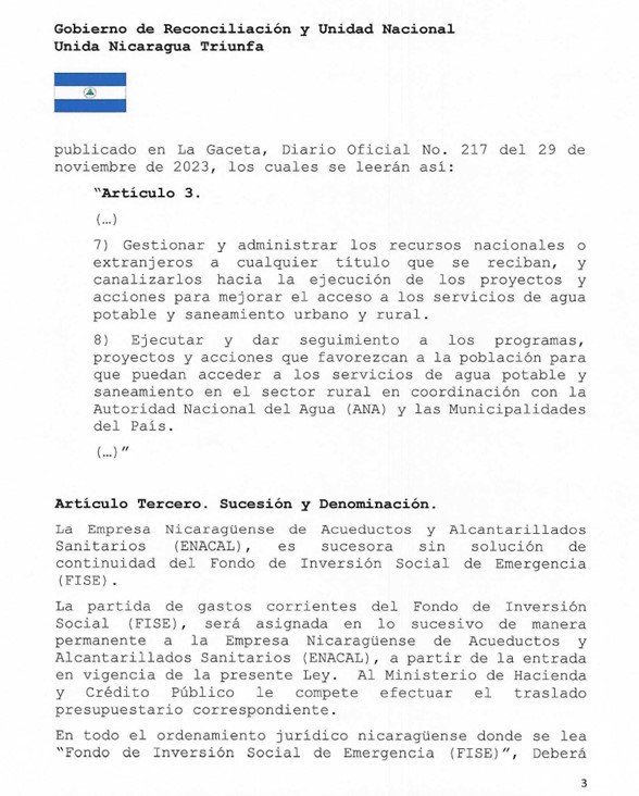 De igual forma se aprobó que “en todo el ordenamiento jurídico nicaragüense donde se lea Fondo de Inversión Social de Emergencia se deberá leerse: Empresa Nicaragüense de Acueductos y Alcantarillados Sanitarios.