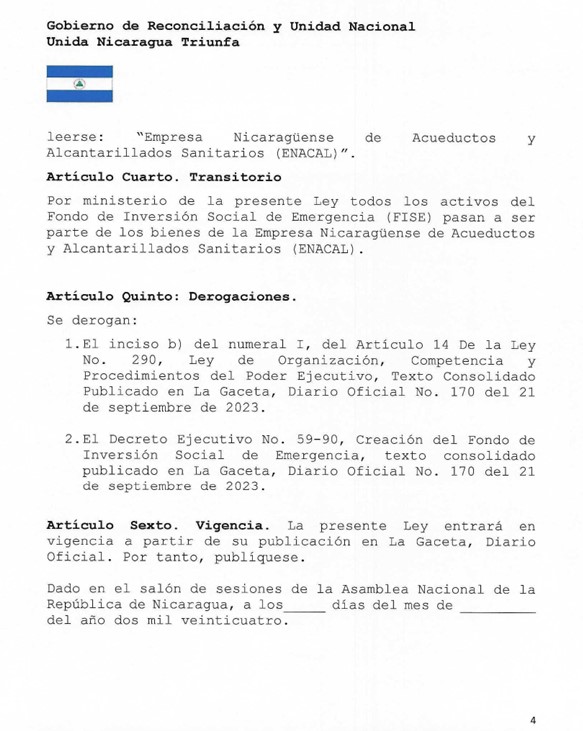 También como Artículo Transitorio, la Asamblea Nacional aprobó que todos los activos del FISE pasan a ser parte de los bienes de la ENACAL y que queda derogado el Decreto Ejecutivo No.59-90, de la Creación del Fondo de Inversión Social de Emergencia, texto consolidado publicado en La Gaceta, Diario Oficial No. 170 del 21 de septiembre de 2023.