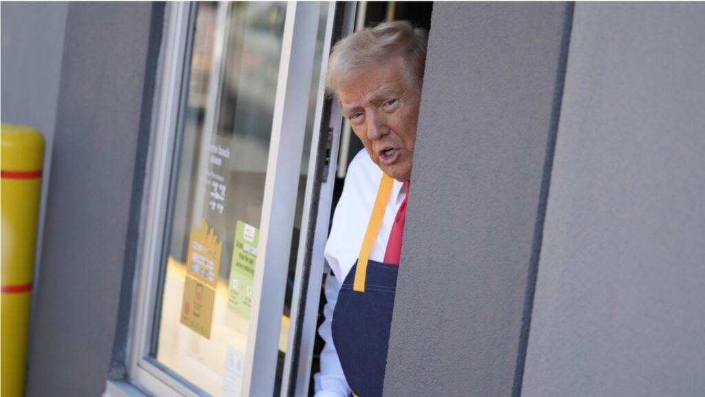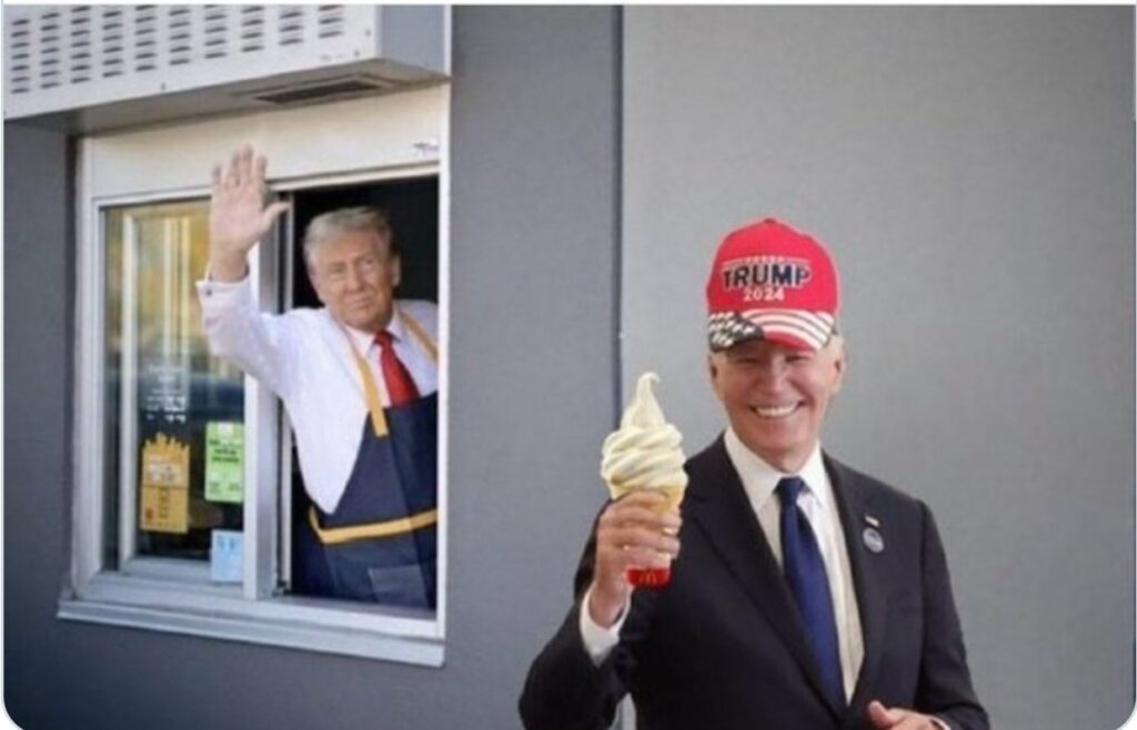 En este contexto, Trump publicó en su cuenta en la red TruthSocial un montaje en el que aparece de fondo saludando desde la ventanilla de autoservicio del McDonald’s y en un primer plano se ve a un sonriente presidente Joe Biden con un helado en la mano y una gorra de campaña del republicano.
