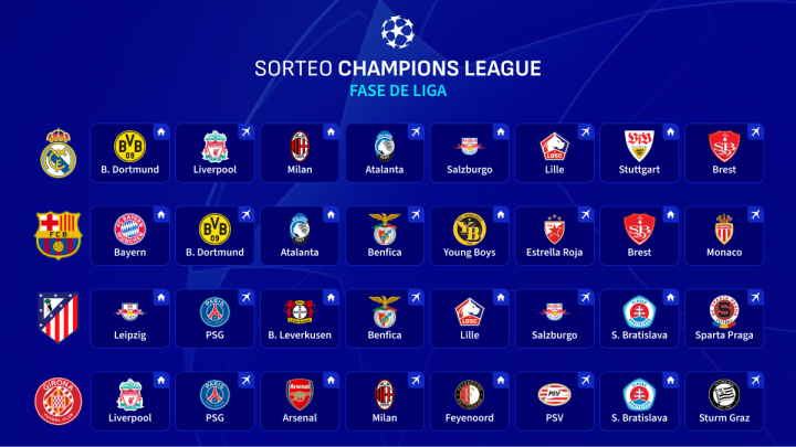 Barcelona. Local contra: Bayern, Atalanta, Young Boys y Stade Brest. Visitante contra: Borussia Dortmund, Benfica, Estrella Roja y Mónaco.