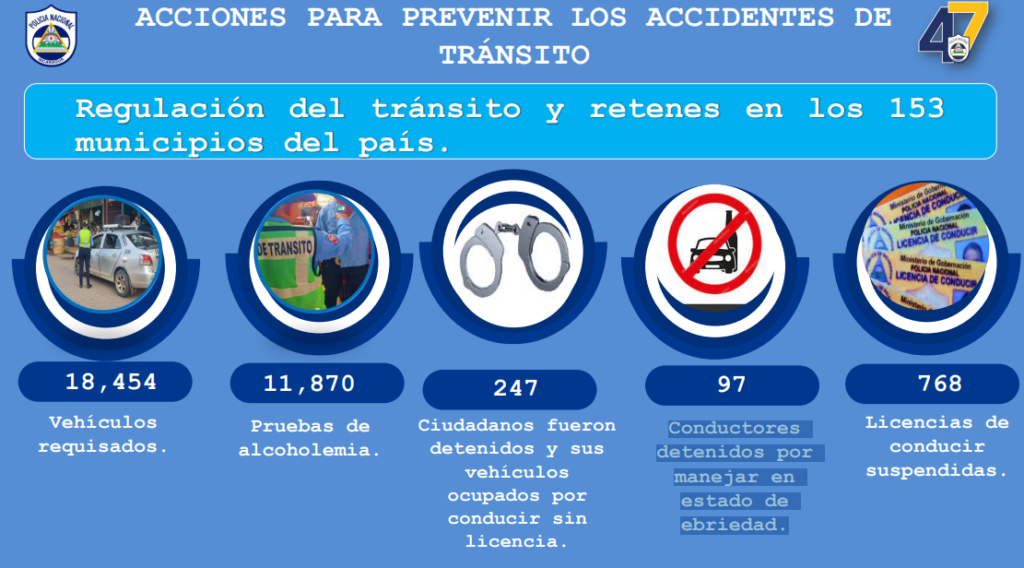 La Policía Nacional reportó que en el período del 9 al 15 de marzo, detuvieron a 97 personas por manejar en estado de ebriedad, además de 247 por manejar sin licencia y se suspendieron 768 licencias.