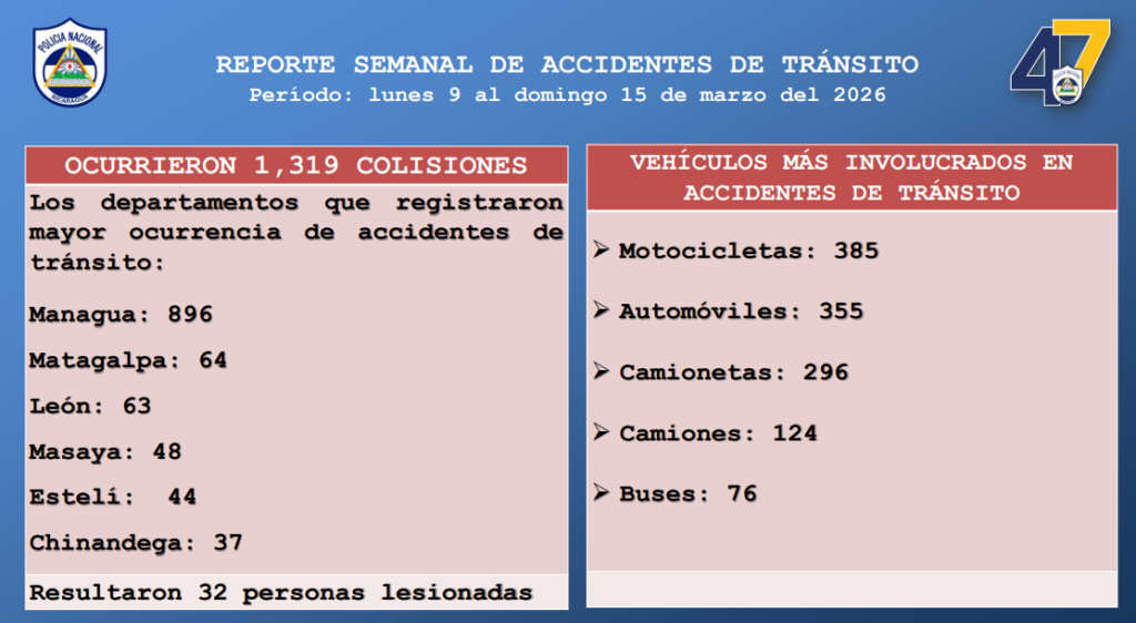 La Cojefa de Relaciones Públicas de la Policía Nacional, detalló este martes que ocurrieron mil 319 colisiones y 32 personas lesionadas, lo que significó una disminución en comparación con la semana anterior (del 2 al 8 de marzo), cuando se contabilizaron mil 349 accidentes y 50 lesionados.