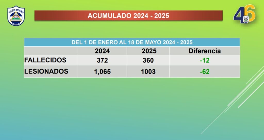 “En el acumulado del primero de enero al 18 de mayo 2024-2025 tenemos una diferencia de menos 12 los fallecidos y menos 62 los lesionados”, refirió la jefa policial.