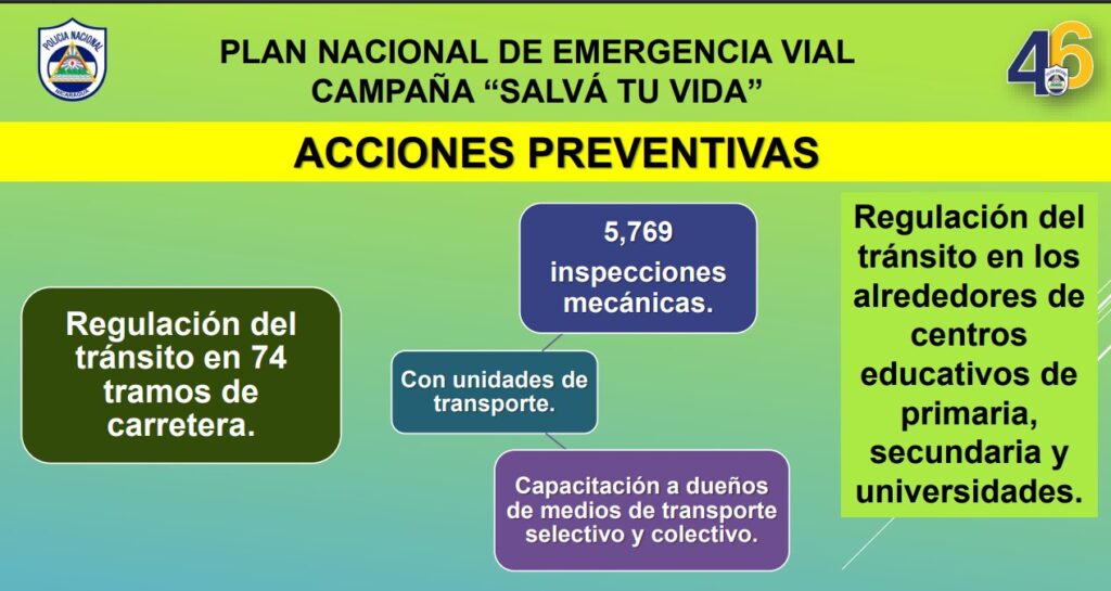“Dentro de los planes de vigilancia y patrullaje se brindó presencia policial en los 153 municipios del país de acuerdo a la ocurrencia de accidentes de tránsito en cada lugar. Como resultado, 3 mil 57 vehículos fueron requisados y mil 25 pruebas de alcoholemia se realizaron, siendo 84 conductores detenidos por conducir en estado de embriaguez y 424 licencias de conducir suspendidas”, detalló la Cojefa de Relaciones Públicas de la institución del orden público, subcomisionada Karen Obando.