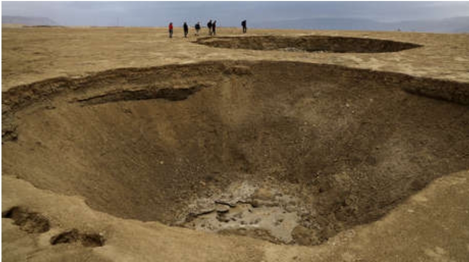 El entonces oasis ubicado en la ribera oeste del mar Muerto, llamado Ein Gedi, donde décadas atrás la gente se relajaba en las piscinas y se bañaba en el mar, ahora está cubierto con espantosos cráteres que dejó el agua al alejarse unos tres kilómetros de la antigua orilla. El centro turístico se ha convertido en un “pueblo fantasma” con toda la infraestructura echada a perder por la propagación de rupturas del terreno y aparición de cráteres.