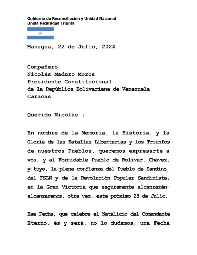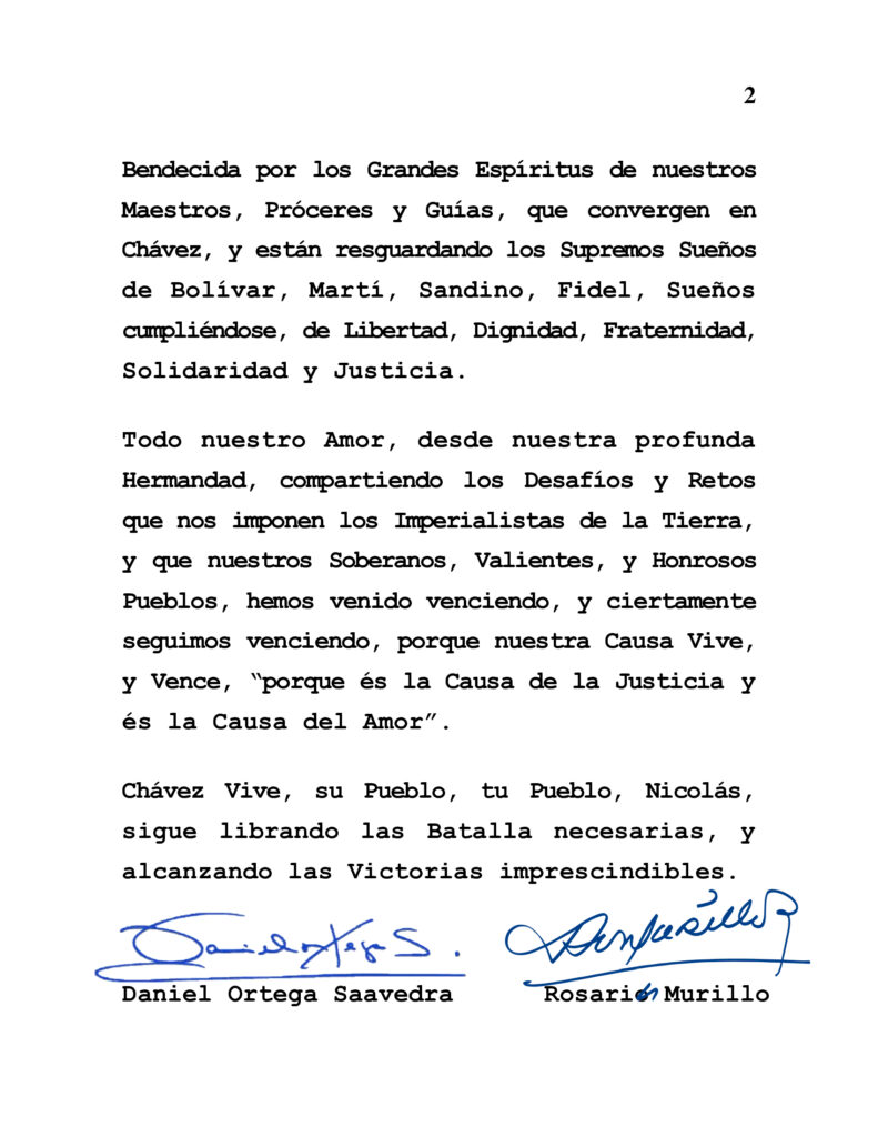 En nombre de la Memoria, la Historia, y la Gloria de las Batallas Libertarias y los Triunfos de nuestros Pueblos, queremos expresarte a vos, y al Formidable Pueblo de Bolívar, Chávez, y tuyo, la plena confianza del Pueblo de Sandino, del FSLN y de la Revolución Popular Sandinista, en la Gran Victoria que seguramente alcanzarán-alcanzaremos, otra vez, este próximo 28 de Julio