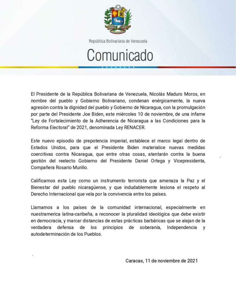 El Presidente de la República Bolivariana de Venezuela, Nicolás Maduro Moros, en nombre del pueblo y Gobierno Bolivariano, condenan enérgicamente, la nueva agresión contra la dignidad del pueblo y Gobierno de Nicaragua, con la promulgación por parte del Presidente Joe Biden, este miércoles 10 de noviembre, de una infame “Ley de Fortalecimiento de la adherencia de Nicaragua a las condiciones para la Reforma Electoral” de 2021, denominada Ley RENACER.