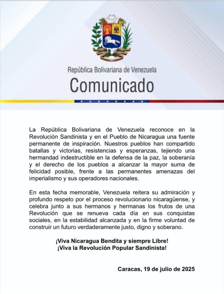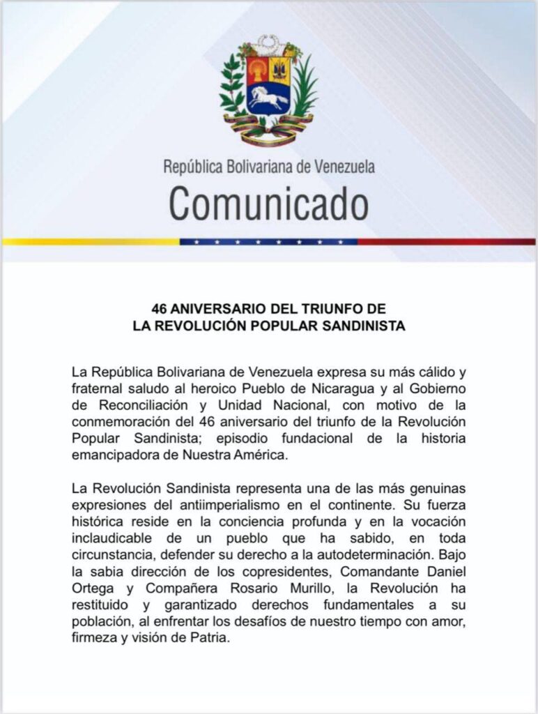A través de un comunicado el gobierno de la República Bolivariana de Venezuela, transmitió los saludos al pueblo nicaragüense al celebrar el 46 aniversario del histórico triunfo de la Revolución Popular Sandinista.