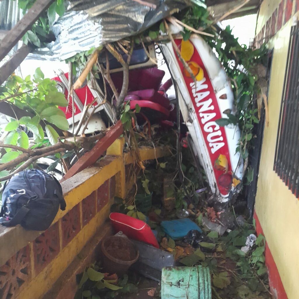 Según datos preliminares el pesado vehículo que cubre la ruta Managua – Río Blanco, placa BO 0068, se volcó y una parte del camastro se estrelló contra una vivienda, luego que presuntamente el conductor intentó esquivar a un motociclista que le invadió el carril.