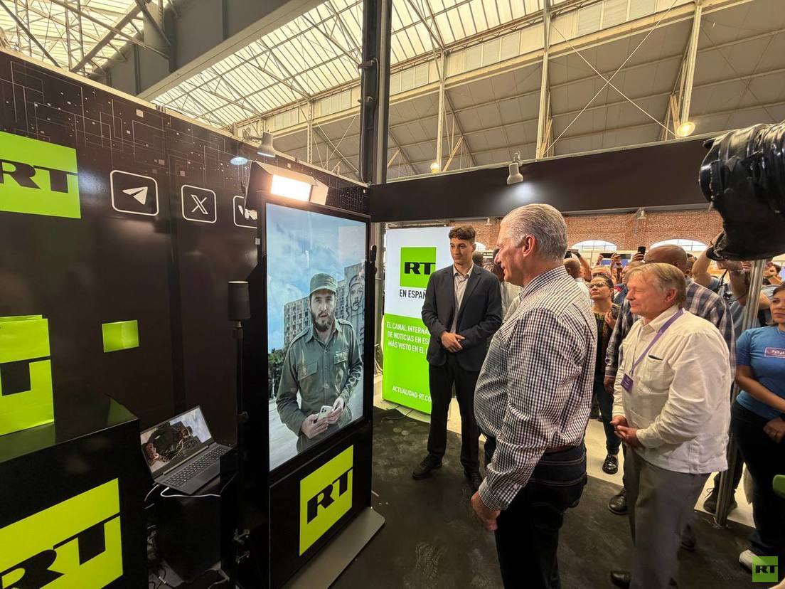 El presidente de Cuba, Miguel Díaz-Canel, visita el estand de RT en el V Coloquio Internacional Patria de Comunicación DigitalRT